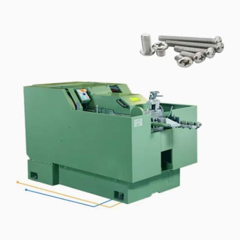 Винтът, който изработва машина за преобръщане на винтове. Той изправя стоманената тел, изрязва я по дължина, образува главата (диска глава/шестоъгълна глава/глава на фермата) и търкаля резбата. Основният модел изисква оператор; Автоматизираният модел може да работи с много малък надзор.